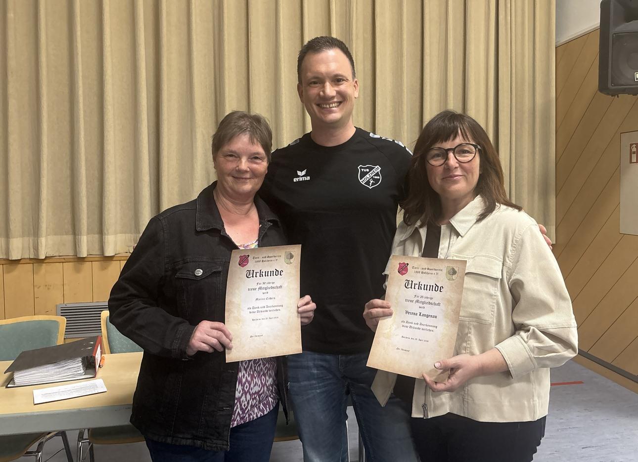 Der TuS-Vorsitzende André Hoffmeister ehrte Marina Enders (links) für 50 und Verena Langenau (rechts) für 25 Jahre Mitgliedschaft im Verein.